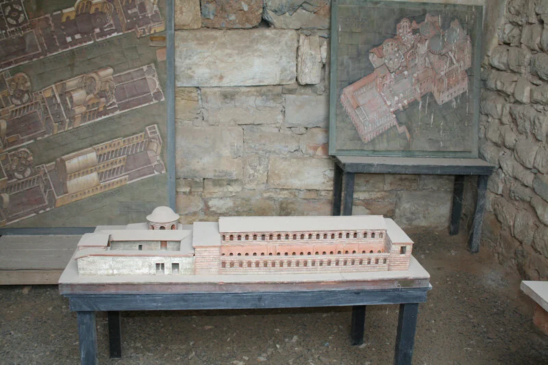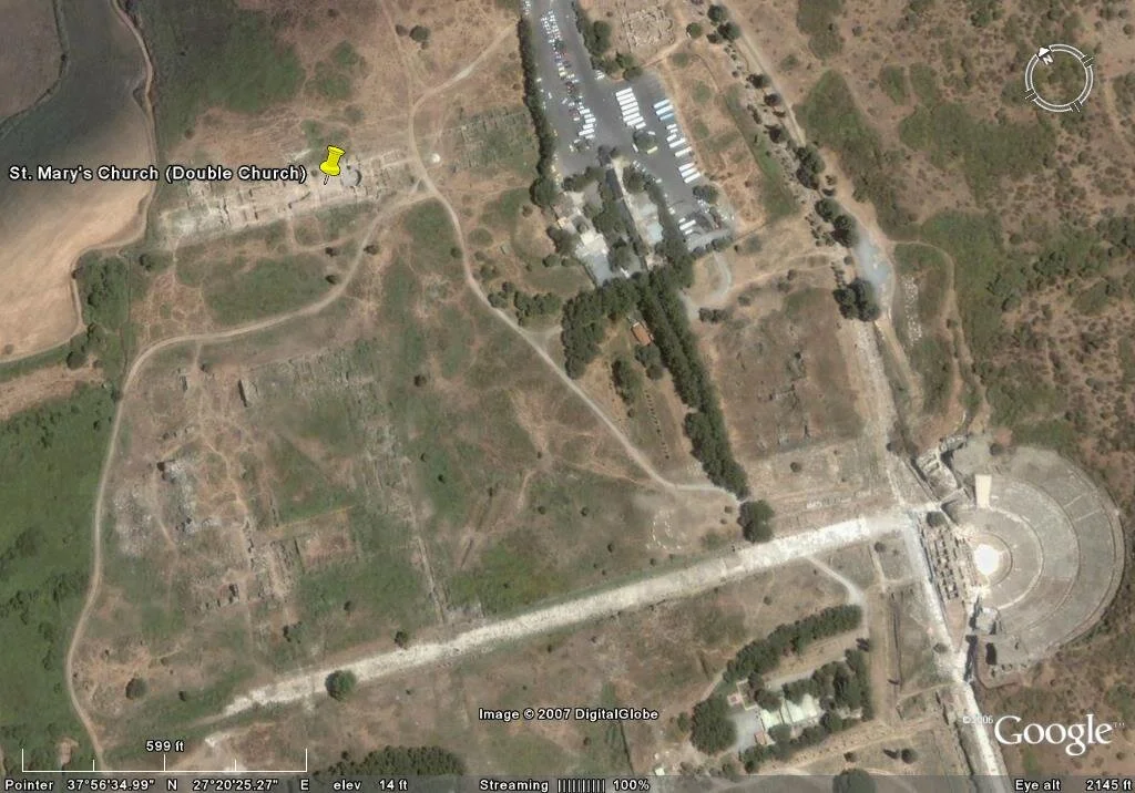 The building received the canonical name of the “holiest church of the most holy, most honoured and eternal virgin Mary.” In later years, a complete alteration of the complex and a massive reconstruction was made necessary due to an earthquake which severely damaged the church. During this renovation, in the region in front of the apse, free-standing stone pilasters were erected instead of the columns; and the west part of the church was rebuilt as a vaulted dome church, with its own apse, using massive brick construction. The church was divided in two, with one part dedicated to St. John the Evangelist and the remainder to Mary, resulting in the name the “Double Church” by some. The Church of St. Mary served as a cemetery church until at least the 11th century, and many graves can be found at the entry plaza.